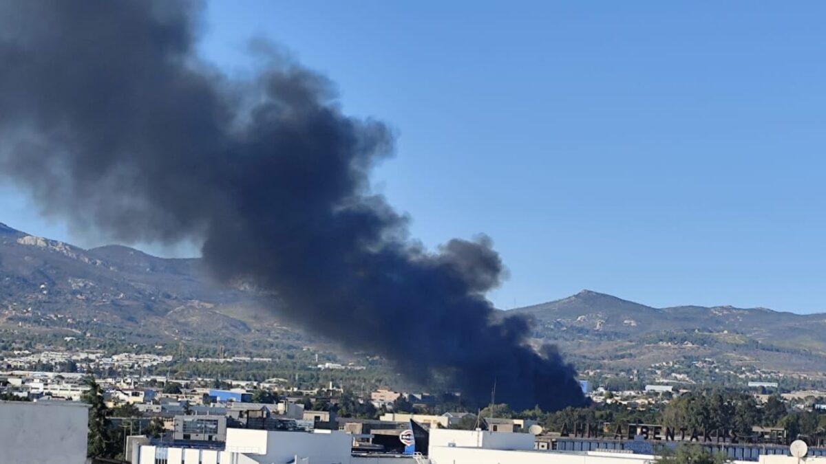 Η πυρκαγιά ξέσπασε σε προαύλιο χώρο εργοστασίου με παλέτες στην οδό Τατοΐου, ενώ οι έντονοι μαύροι καπνοί φαίνονται από πολύ μακριά.