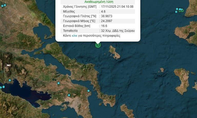 Στις 17/11/2025 και ώρα 23:04:10, σημειώθηκε σεισμική δόνηση μεγέθους 5,0 Ρίχτερ, με εστιακό βάθος 10 χιλιομέτρων, σε απόσταση περίπου 30,9 χλμ δυτικά-βορειοδυτικά της Σκύρου