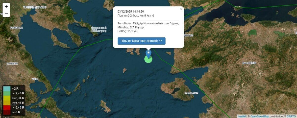 Σεισμός 2,7 Ρίχτερ 45,2χλμ Νοτιοανατολικά από Λήμνος στις 03/12/2025