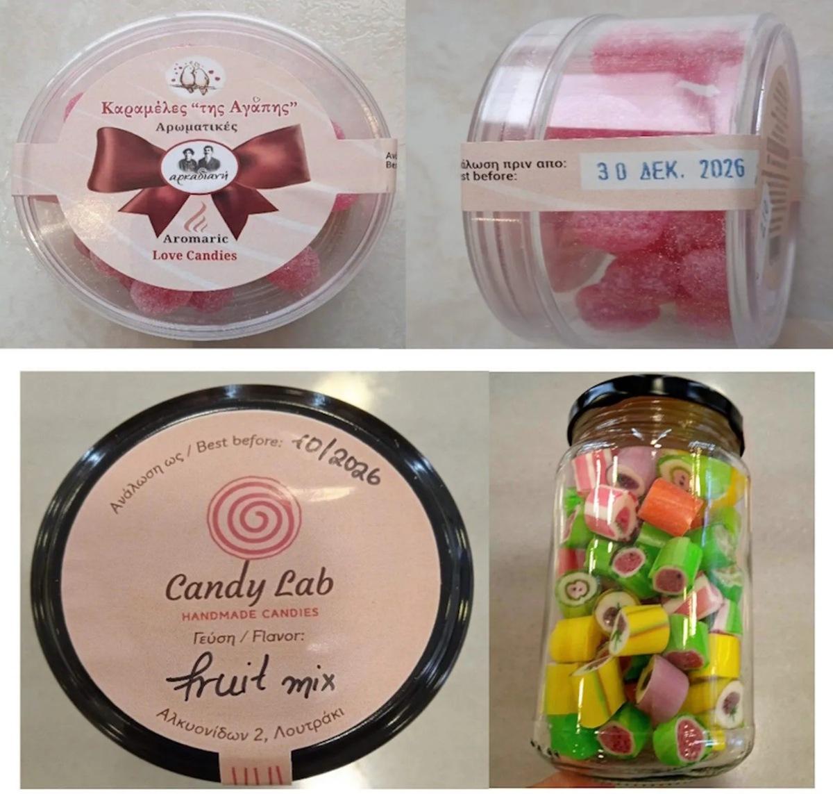 - Καραμέλες «fruit mix» με ημερομηνία ανάλωσης ως 10/2026, συσκευασίας καθαρού βάρους περίπου 230g, το οποίο παράγεται και συσκευάζεται στην Ελλάδα από την «Candy Lab» που εδρεύει στο Λουτράκι Κορινθίας.