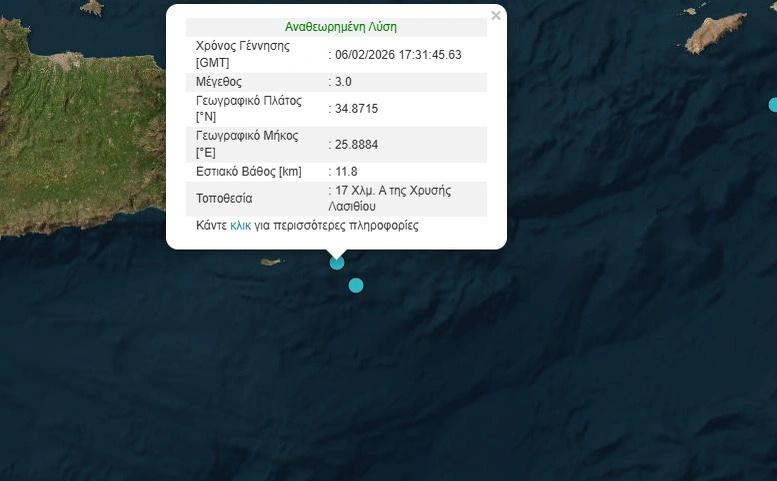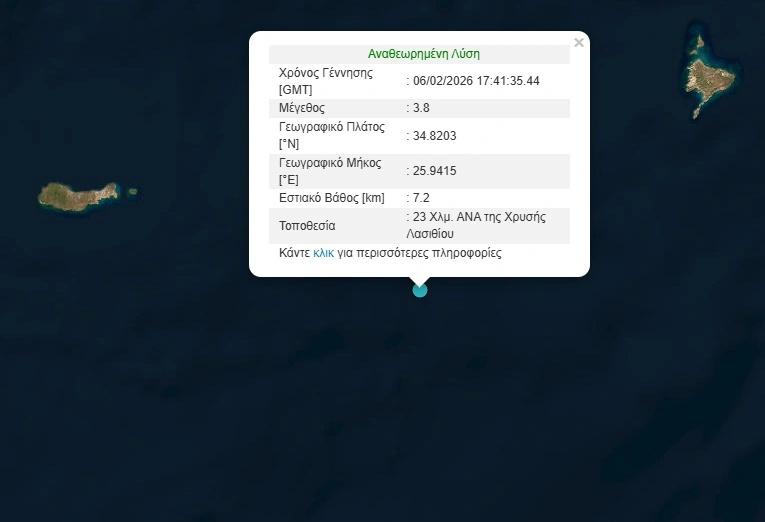 Σεισμική κινητικότητα καταγράφηκε το βράδυ της Πέμπτης στο Λασίθι, προκαλώντας ανησυχία στους κατοίκους της περιοχής. Μέσα σε διάστημα μόλις 17 λεπτών σημειώθηκαν δύο διαδοχικές σεισμικές δονήσεις, οι οποίες έγιναν αισθητές σε κοντινούς οικισμούς.