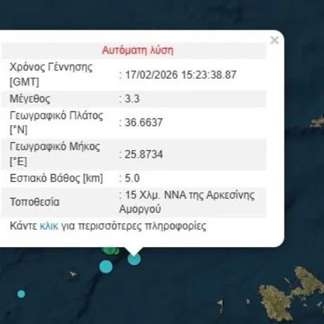 Σεισμός 3,3 Ρίχτερ σημειώθηκε νωρίτερα, το απόγευμα της Τρίτης (17/2) στην Αμοργό.