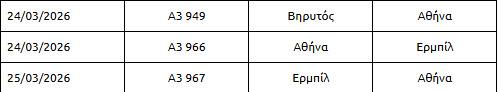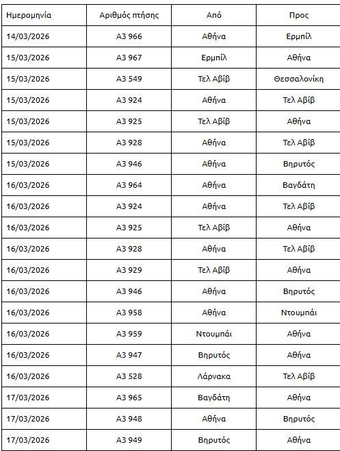 Επιπλέον, η AEGEAN ενημερώνει ότι, με στόχο τη διευκόλυνση των επιβατών που διαθέτουν εισιτήρια από και προς το Ριάντ για πτήσεις από 14 Μαρτίου έως 20 Μαρτίου 2026, το Τελ Αβίβ και το Ντουμπάι για πτήσεις από 21 Μαρτίου έως 1 Απριλίου 2026, από και προς το Ερμπίλ, τη Βαγδάτη και τη Βηρυτό για πτήσεις από 26 Μαρτίου έως 1 Απριλίου 2026, παρέχει, εφόσον το επιθυμούν, τη δυνατότητα τροποποίησης των πτήσεων είτε με δωρεάν επανέκδοση και αλλαγή των εισιτηρίων, χωρίς επιπλέον κόστος, για νέα ταξίδια με ημερομηνία αναχώρησης έως και τις 30 Απριλίου 2026, είτε με ακύρωση της κράτησης και έκδοση credit voucher για μελλοντική χρήση.