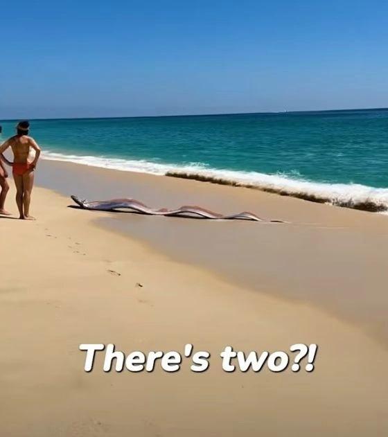 Λίγα μέτρα πιο πέρα εμφανίστηκε και δεύτερο παρόμοιο πλάσμα, το οποίο επίσης πάλευε να κινηθεί μέσα στο νερό. Οι λουόμενοι που βρίσκονταν στην παραλία κοιτούσαν αποσβολωμένοι, καθώς το θέαμα ήταν κάτι που ελάχιστοι άνθρωποι έχουν δει από κοντά.